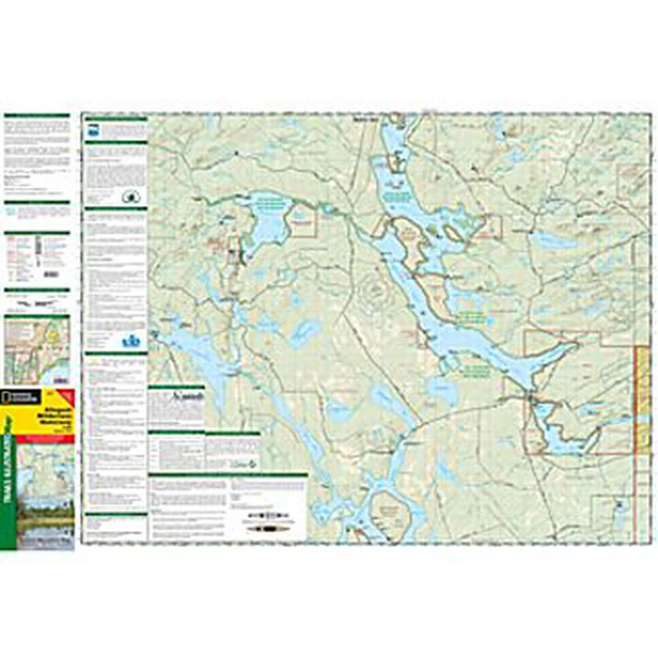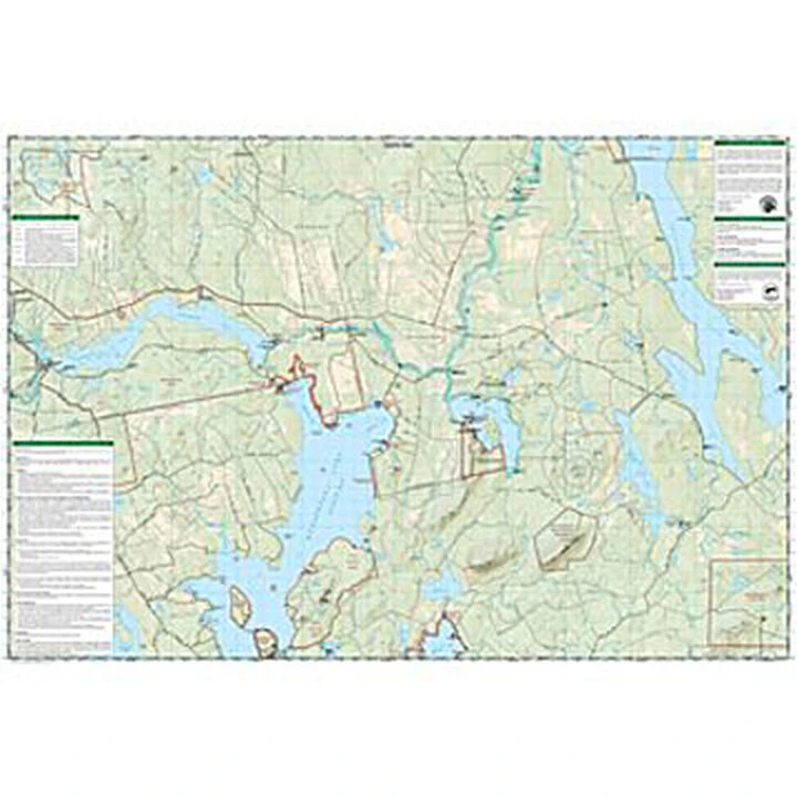 The front side of the Allagash Wilderness Waterway South map details from the southern portion of Eagle Lake to the northwestern edge of Baxter State Park and the northern reaches of Chesuncook Lake. It includes Allagash Lake, Chamberlain Lake, Caucomgomoc Lake, and dozens of other lakes, ponds, brooks, and streams. Chesuncook Lake continues on the back side of the map with the southernmost section of the waterway which includes Caribou Lake, Ragged Lake, Lobster Lake, Seboomook Lake, and Moosehead Lake.
