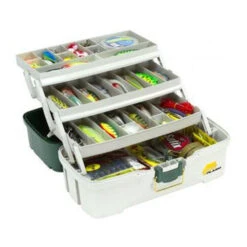 The Three Tray Tackle Box features cantilever trays for easy organization.