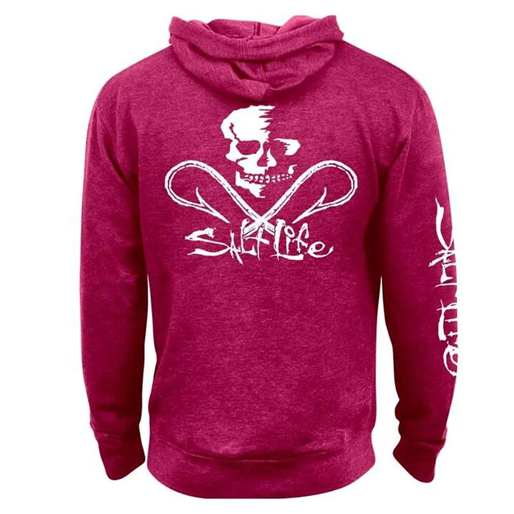 Salt Life® Men’s Skull and Hooks Pullover Hoodie features a front pouch pocket and screenprinted graphics on the left chest, back and sleeve.