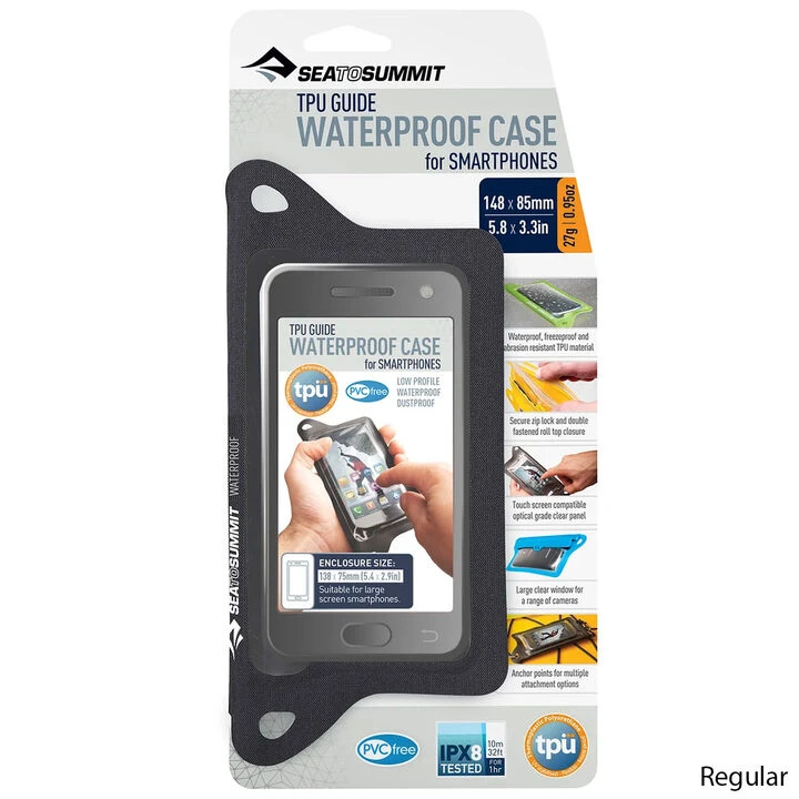 Sea to Summit’s® TPU Guide Waterproof Phone Cases are a slim, yet robust, solution for protecting and using your phone in any conditions. RF welded Thermoplastic Polyurethane (TPU) and the zip lock, triple-roll hook-and-loop fastener keep this soft case both watertight and slim. The TPU is PVC free, strong, flexible, durable, UV and extreme cold resistant. Die-cut attachment points round out this tough little package.